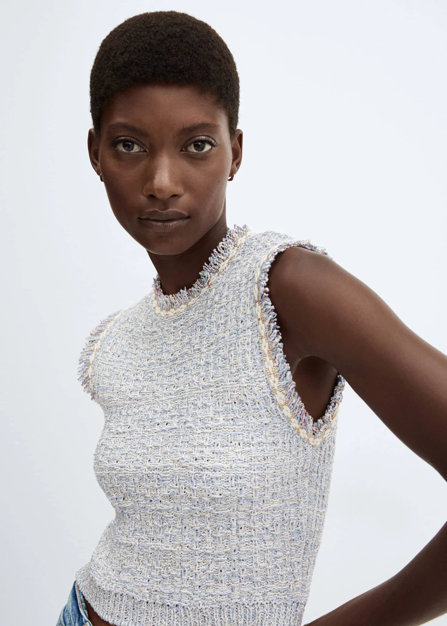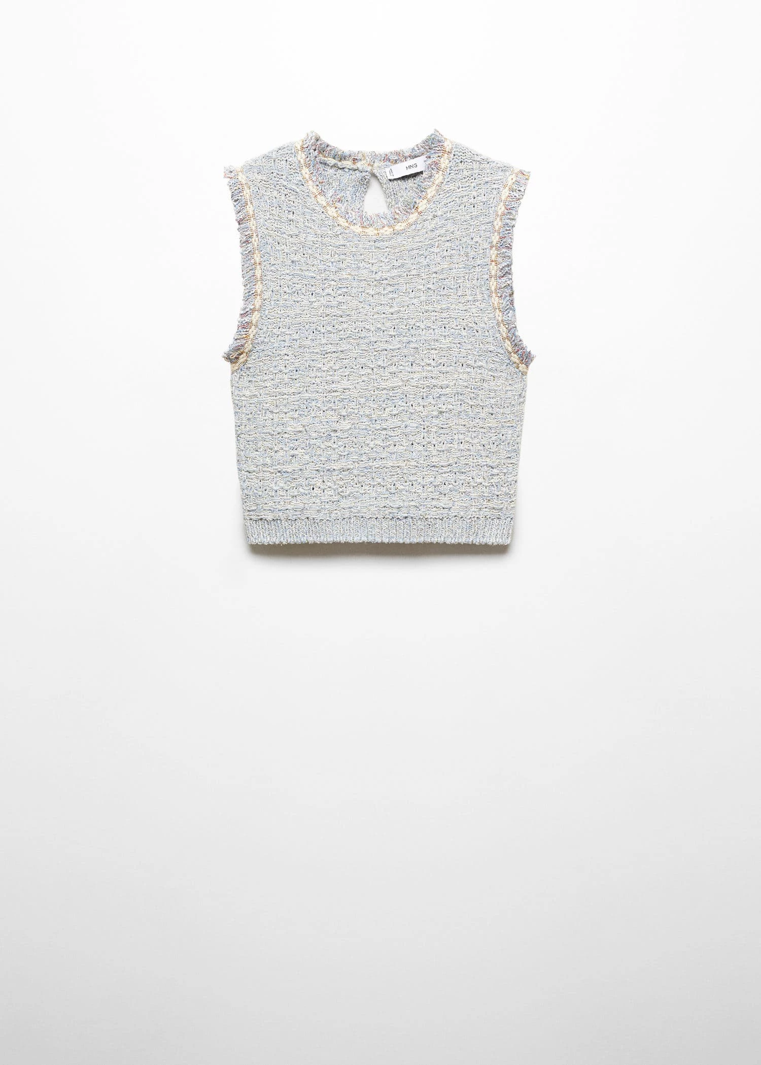 tissu de coton melange, tissu tweed, coupe courte, coupe droite, col rond, sans manches, ouverture dans le dos avec bouton, bouton imitation bijou, total lookComposition: 67% polyester,30% coton,3% polyester avec revêtement de cuivre