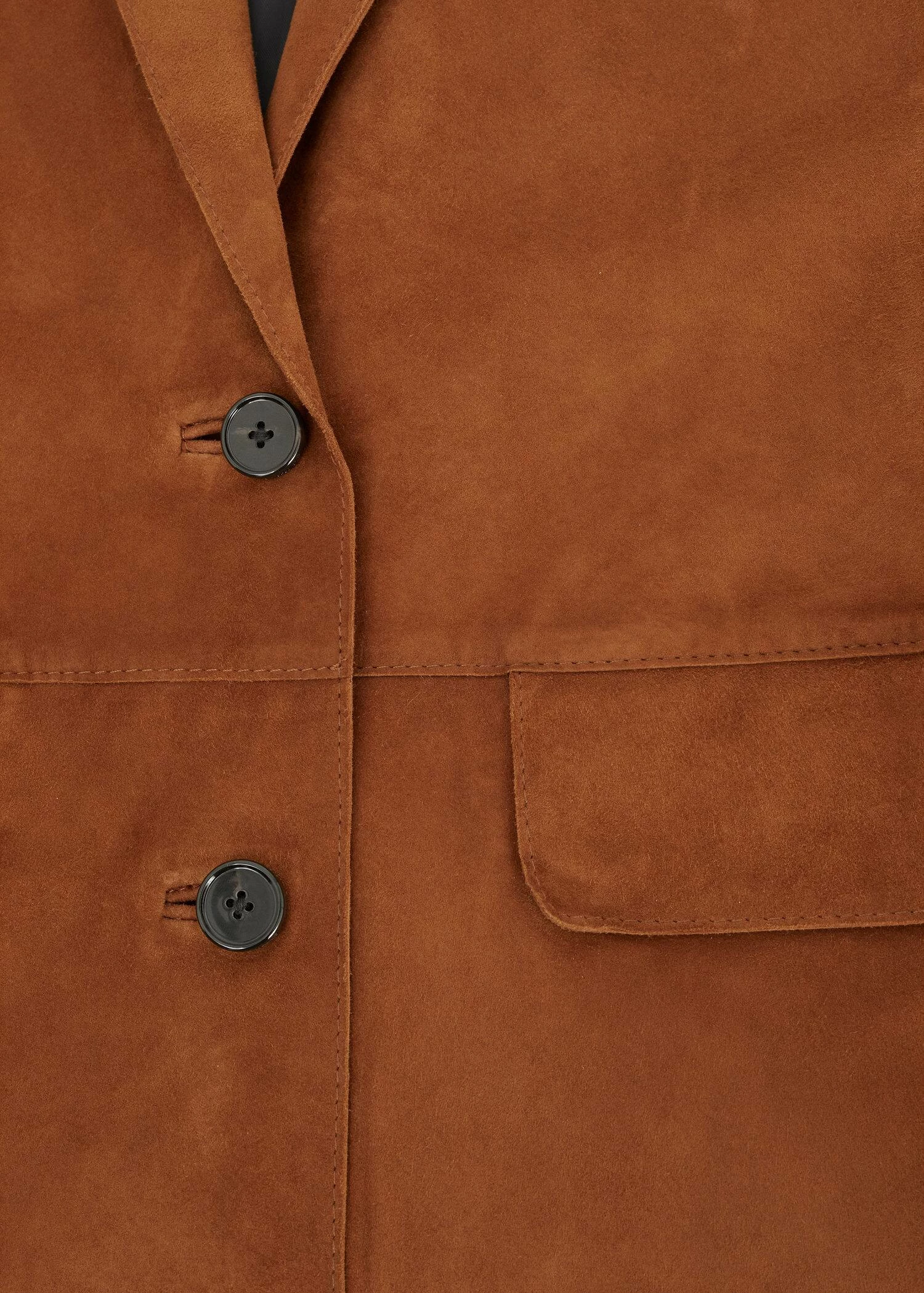 collection selection, 100 % cuir de chevre, daim, style oversize, coupe longue, col en v avec rabat, manches longues avec poignets boutonnes, deux poches passepoilees et a rabat sur le devant, fermeture a deux boutons sur le devant, bas fendu a l’arriere, doublure, total look, une selection de pieces qui vous accompagneront lors du retour au bureau. confectionnee avec des matieres de qualite pour creer une garde-robe feminine et contemporaine pour votre quotidien.