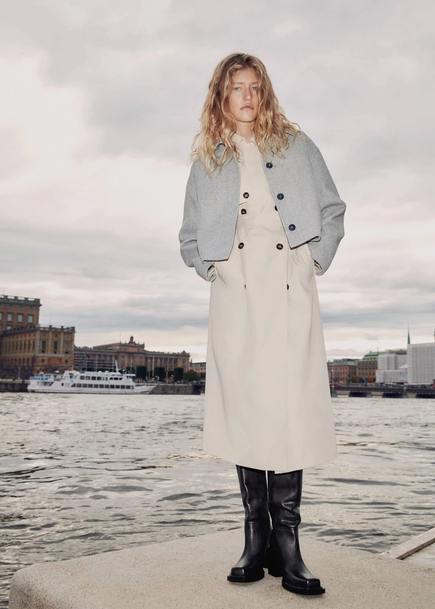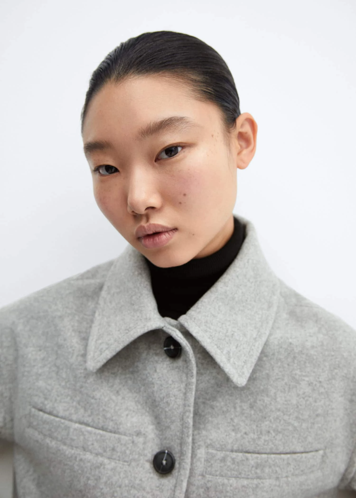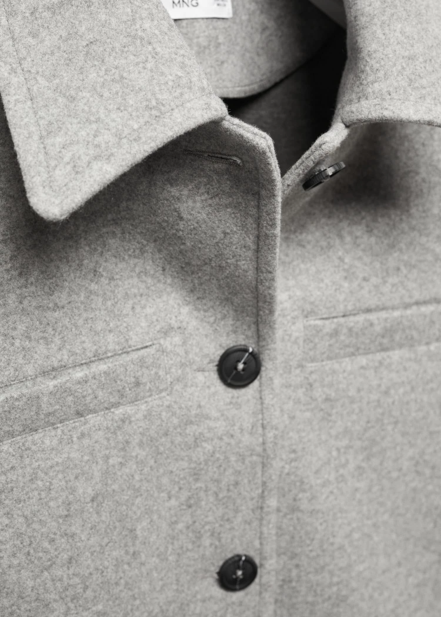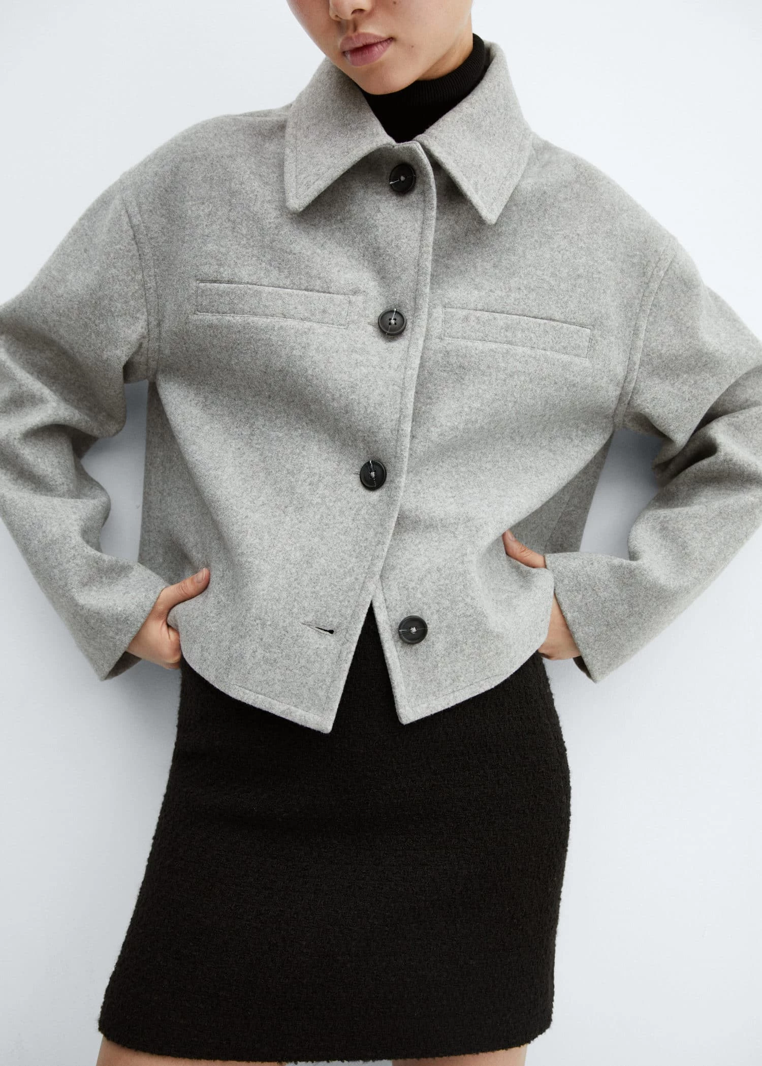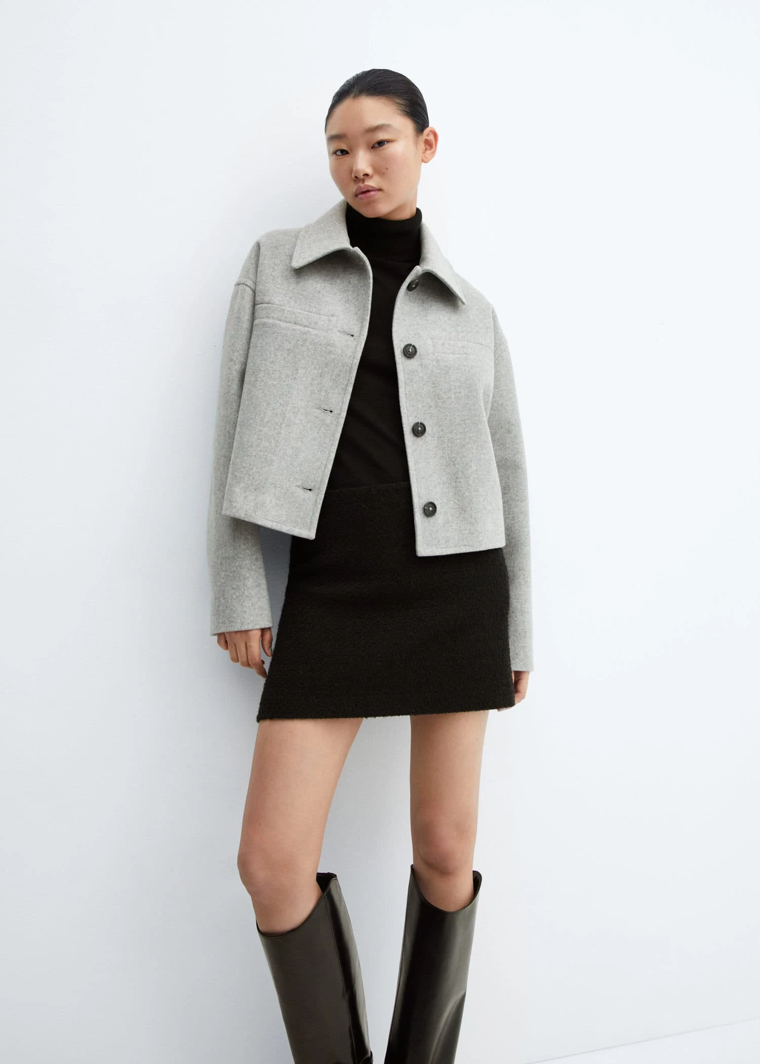 drap, coupe courte, col chemise, manches longues, deux poches passepoilees a l’avant, fermeture boutonnee sur le devant, doublureComposition: 93% polyester,7% viscose
