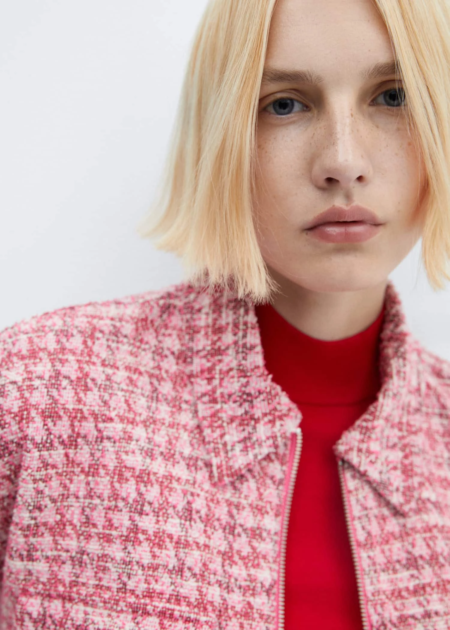 tissu tweed, coupe droite, style bomber, imprime pied-de-poule, col chemise, manches longues avec poignets elastiques, deux poches a rabat a l’avant, fermeture eclair a l’avant, bas elastique, total lookComposition: 50% polyester,34% polyester recyclé,15% coton,1% elasthanne. Interieur: 100% polyester