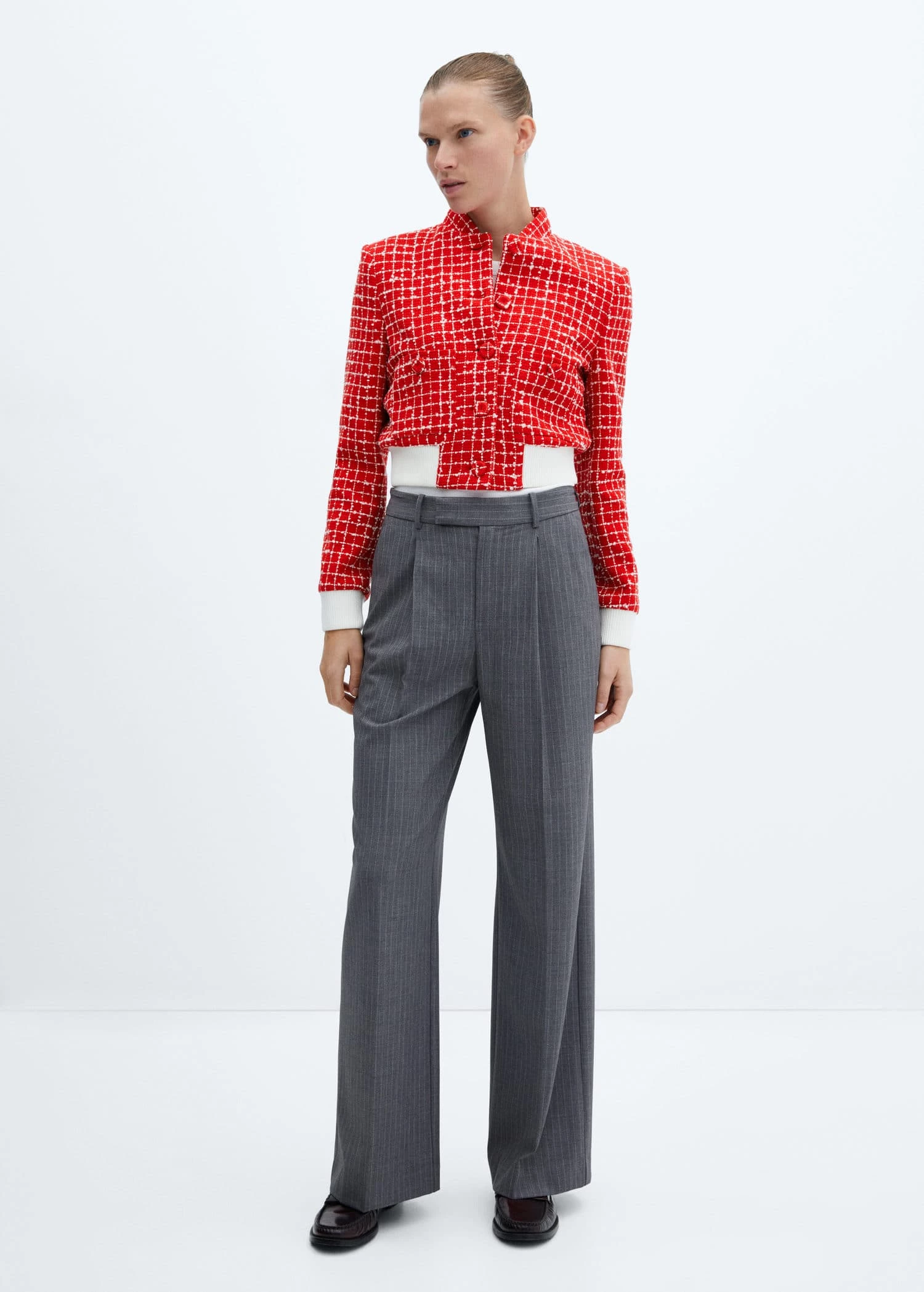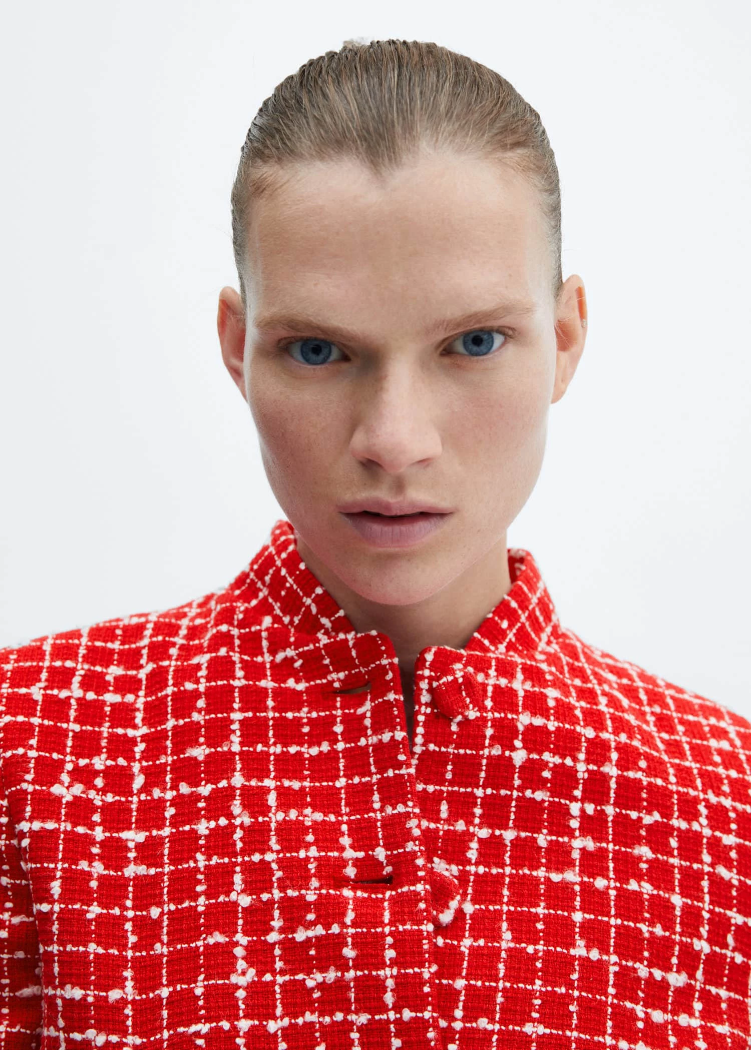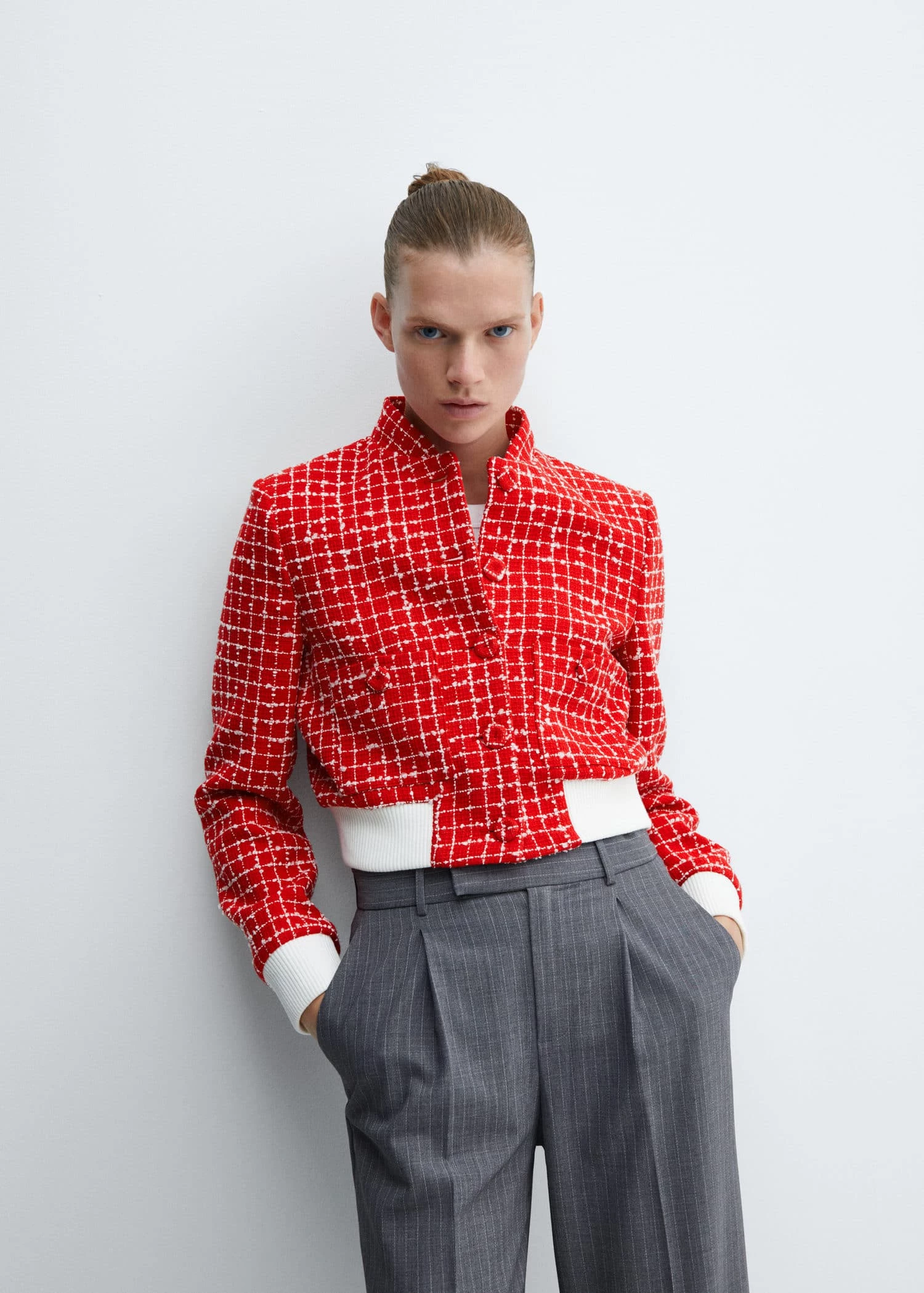 tissu en coton organique recycle melange, tissu tweed, style bomber, coupe courte, col bomber, manches longues avec poignets elastiques, bas elastique, fermeture a boutons sur le devant, deux poches plaquees avec bouton a l’avant, boutons recouverts, doublureComposition: 63% coton,35% acrylique,2% polyamide. Doublure: 52% viscose,48% polyester. Cannelé: 80% coton,12% polyamide,8% elasthanne